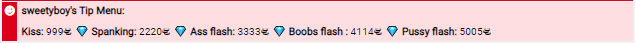When the Tip Menu starts, a message for the model and for all the viewers appears in the chat. When a user joins a cam with an active Tip Menu, a message with the menu shows up in the chat. The message repeats every 5 minutes to all users in the room: models and viewers.