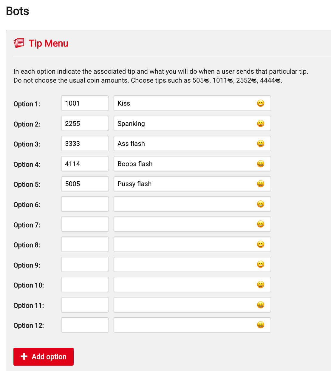 You can set up your Tip Menu as follows: