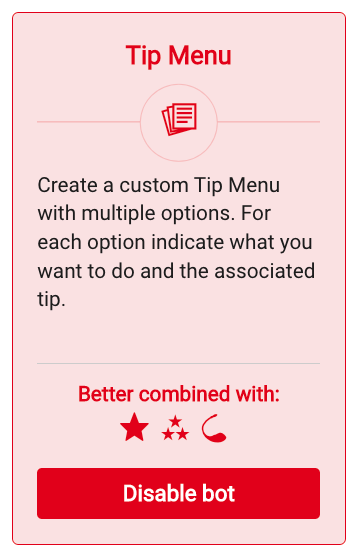 It's super easy! Just open the GAMES tab in your broadcast, select Bots or scroll down, and at the bottom of the Tip Menu, you’ll see the Disable bot button in red, click on it and, voilà, you’ve disabled the bot.